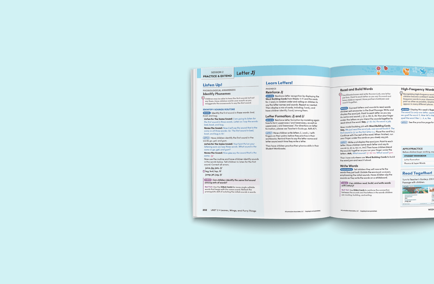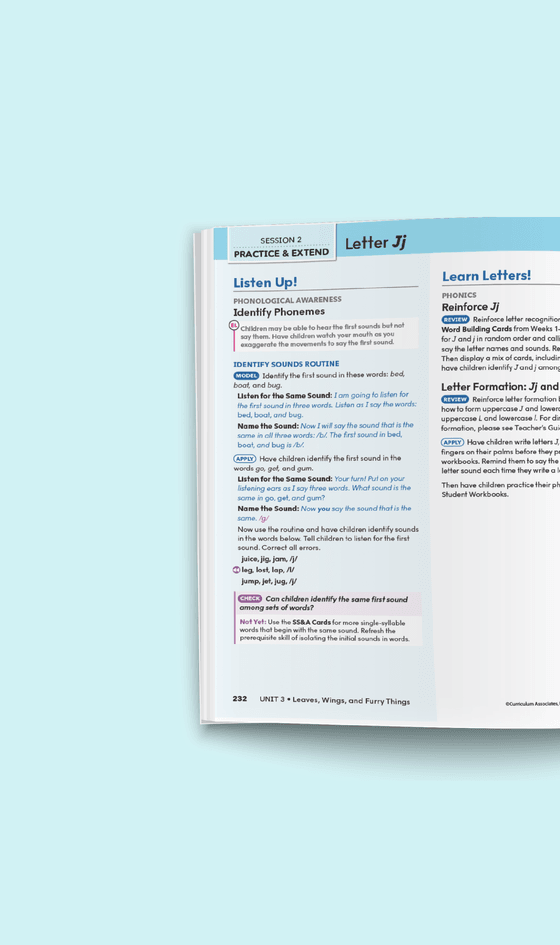 In Session 1, fully scripted instructional routines are used to introduce to new skills in phonological awareness, letter recognition and formation, phonics, high-frequency words, concepts of print, and fluency.