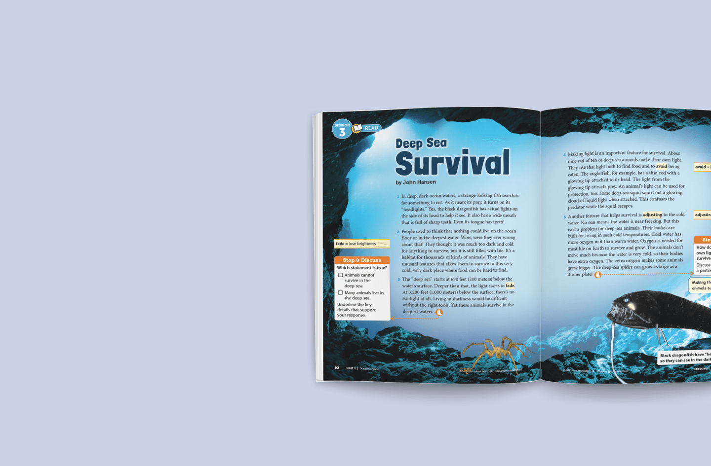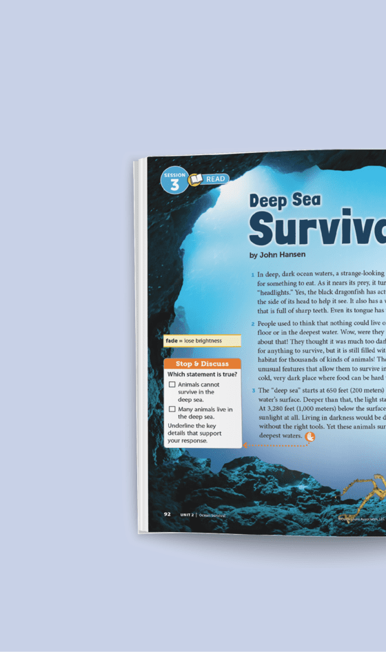 Each text is used over two sessions. Session 3 has students read to understand the text and build knowledge on the topic. Session 4 provides explicit instruction on the Focus Standard.