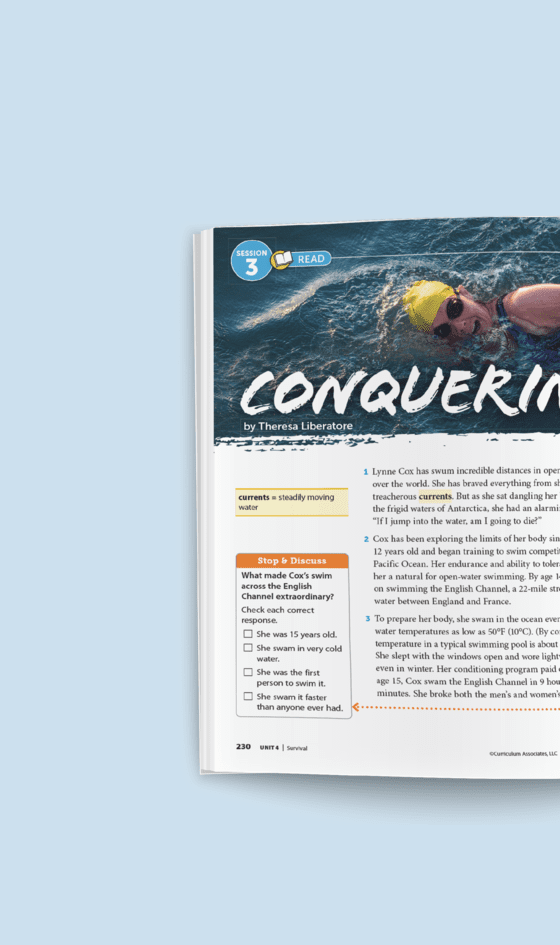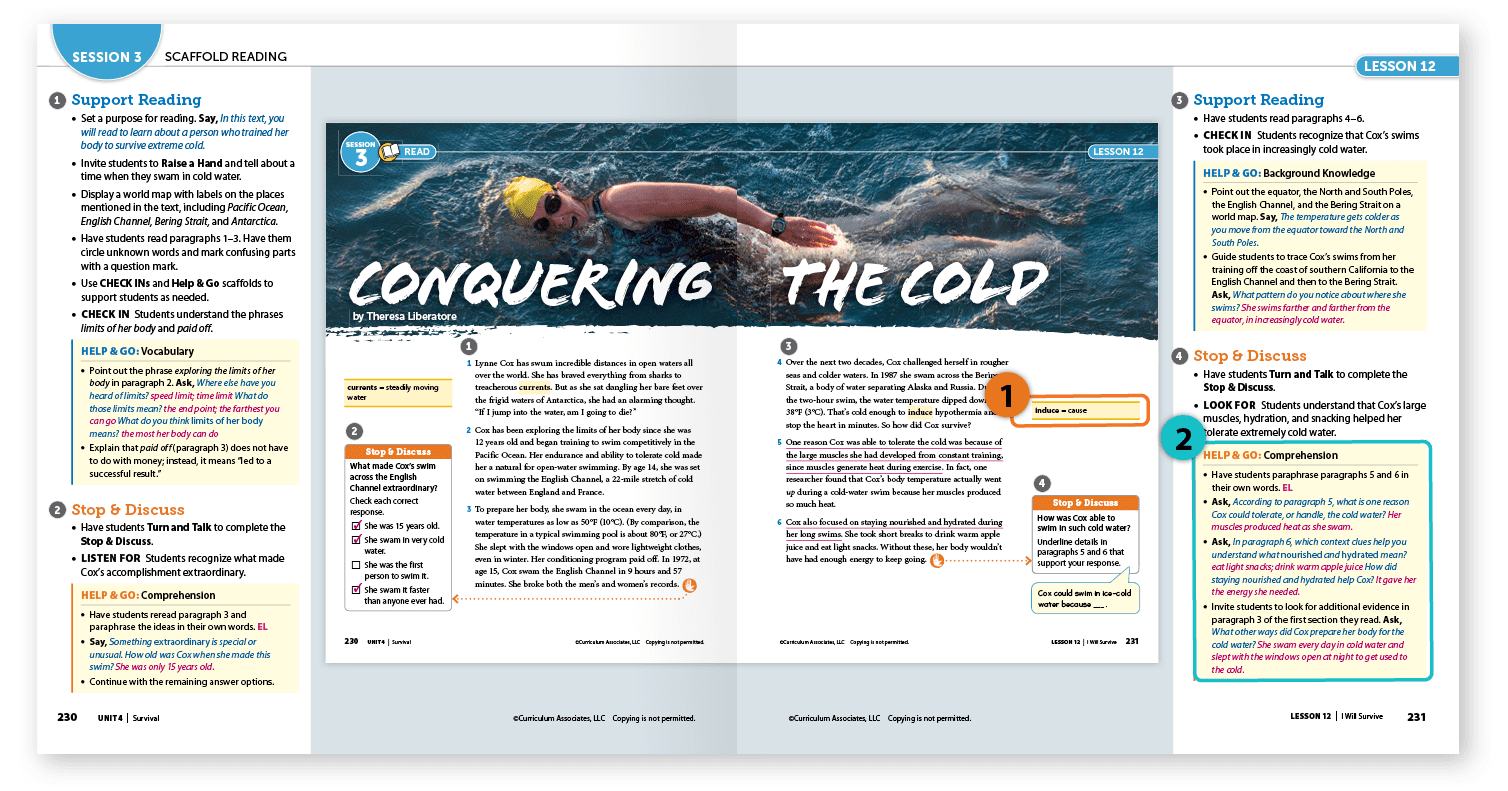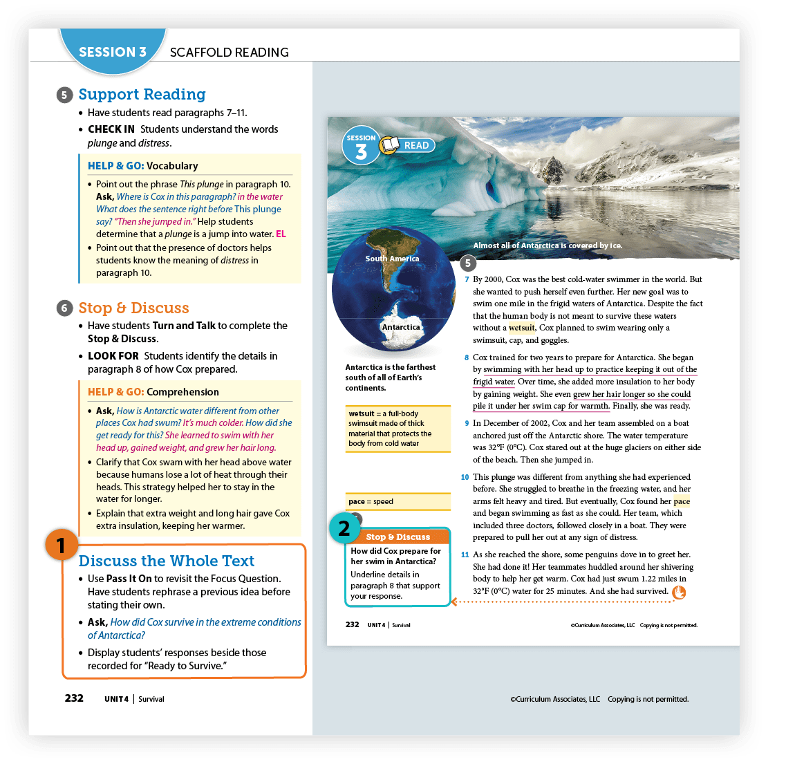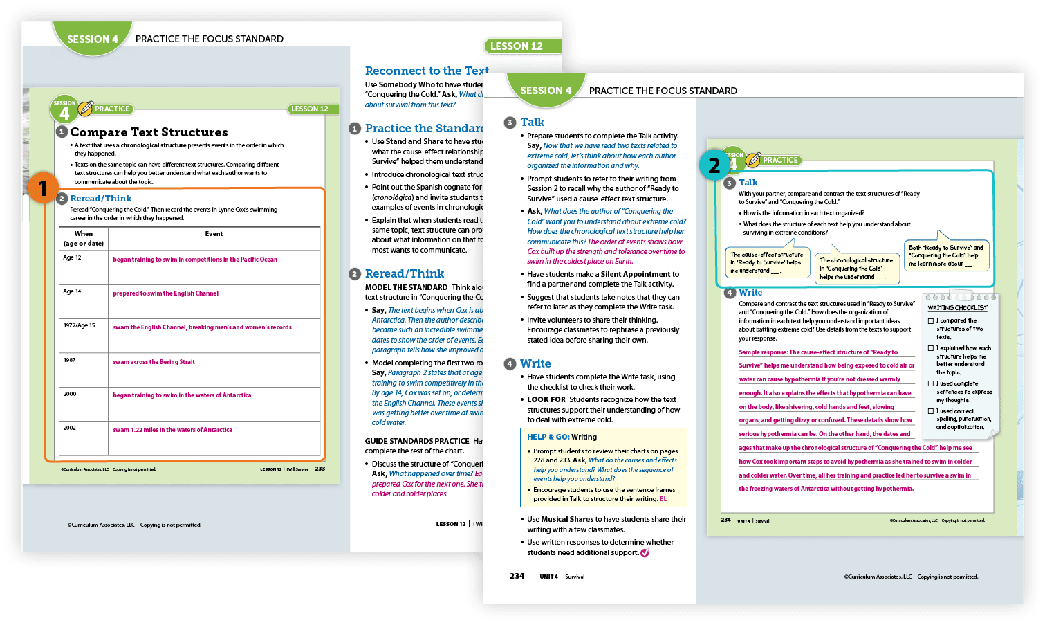 Each text is used over two sessions. Session 3 has students read to understand the text and build knowledge on the topic. Session 4 provides explicit instruction on the Focus Standard.